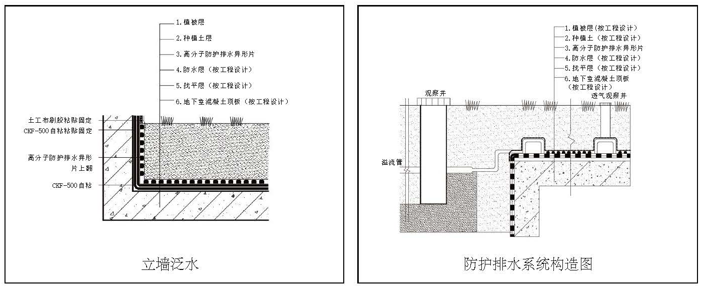 1、按圖紙鋪設虹吸排水槽,采用CKF500自粘卷材粘接于防水層上。