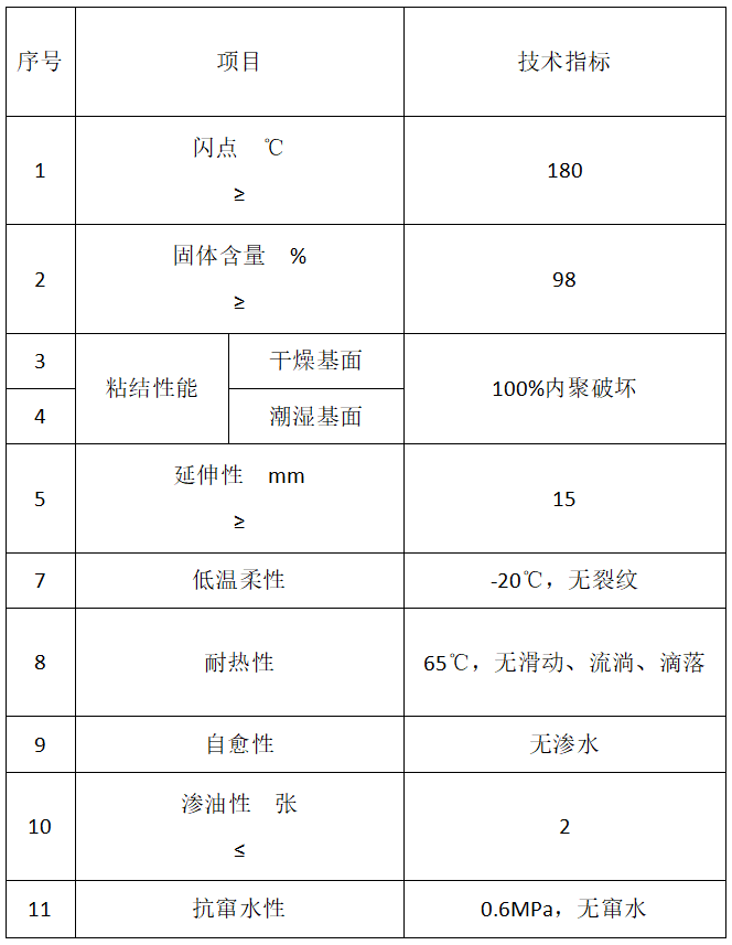 (5)耐溫、耐侯性:非固化防水膠的耐低溫性能可達到-20℃ 以下,耐高溫性能可根據不同工程的需要制作成40—90℃ 之間的任何一個高溫指標。